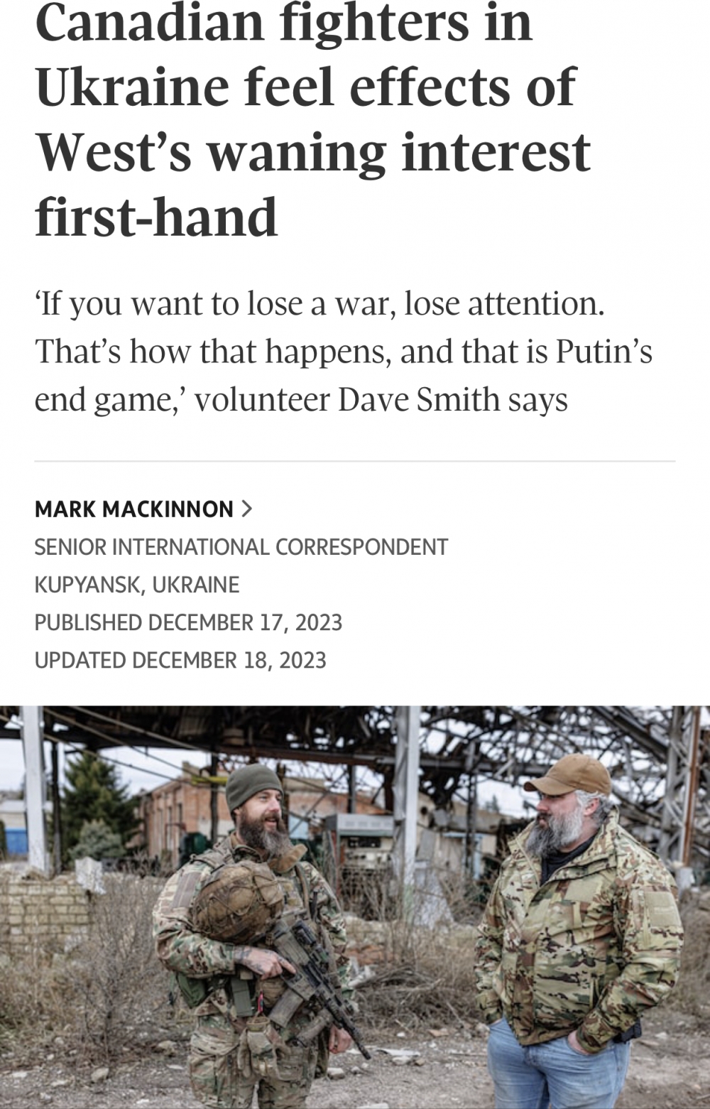 Дэйв и Джастин Смиты из Канады решили высказаться после «трех дней ада», который они пережили под Харьковом, в окопах к востоку от Купянска. В разговоре с канадскими СМИ они практически повторили тезисы главкома ВСУ Валерия Залужного из знаменитой публикации The Economist, назвав положение «тупиковым».