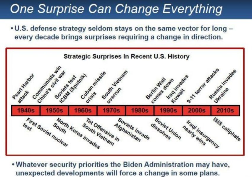 На прошлой неделе на выездном военном совещании представителей Пентагона эксперт представил диаграмму «с подробным описанием крупнейших стратегических сюрпризов за несколько последних десятилетий».