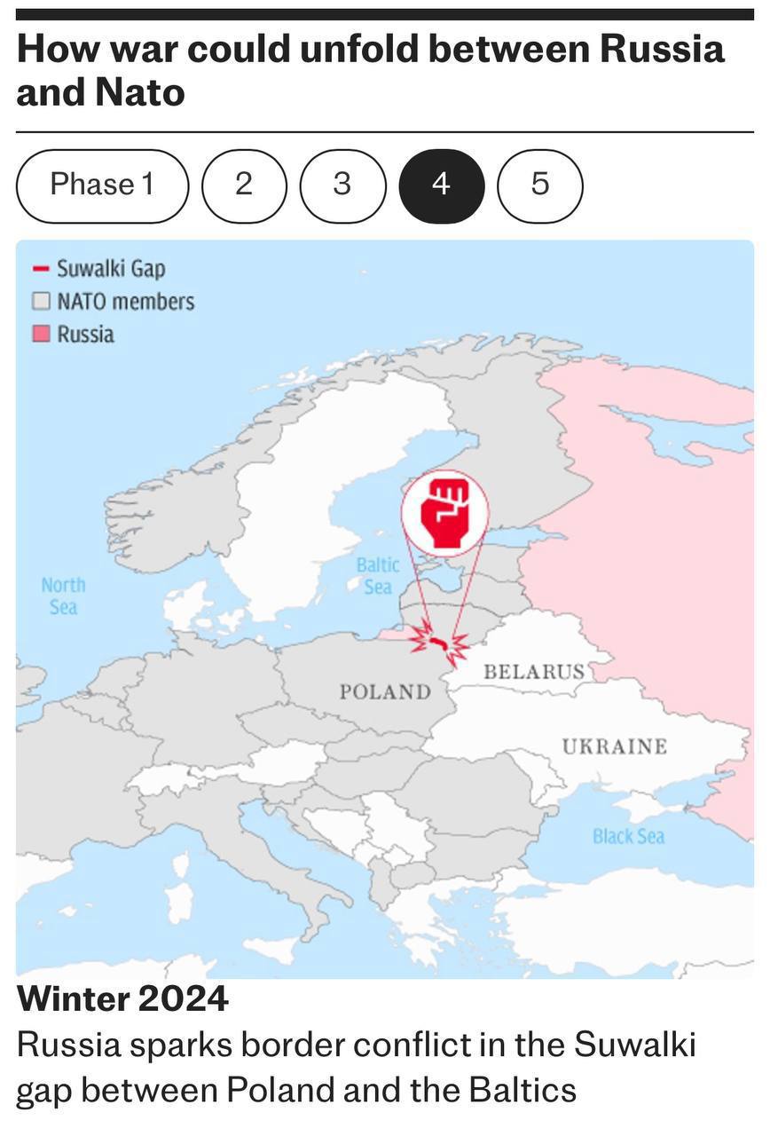 Пятой фазой станет прямая конфронтация между НАТО и Россией. Инфографика показывает, что Путин отправит 70 тыс. военнослужащих в Беларусь, к Сувалкскому коридору. В свою очередь НАТО (на карте отмечена Германия) якобы направит свои силы к румынско-молдавской границе. И «Путин будет решать, начинать наступление ли на эту территорию», — пишет «Телеграф».