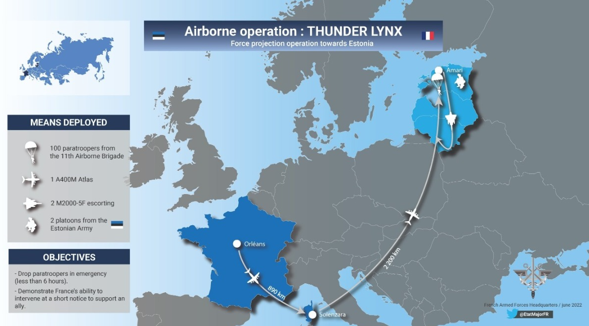 Десантная операция, получившая название Thunder Lynx, «позволила в кратчайшие сроки высадить около 100 иностранных легионеров из 2-го воздушно-десантного полка Франции «на территорию, удерживаемую эстонскими войсками», говорится в заявлении. Затем силы обеих стран провели учения.