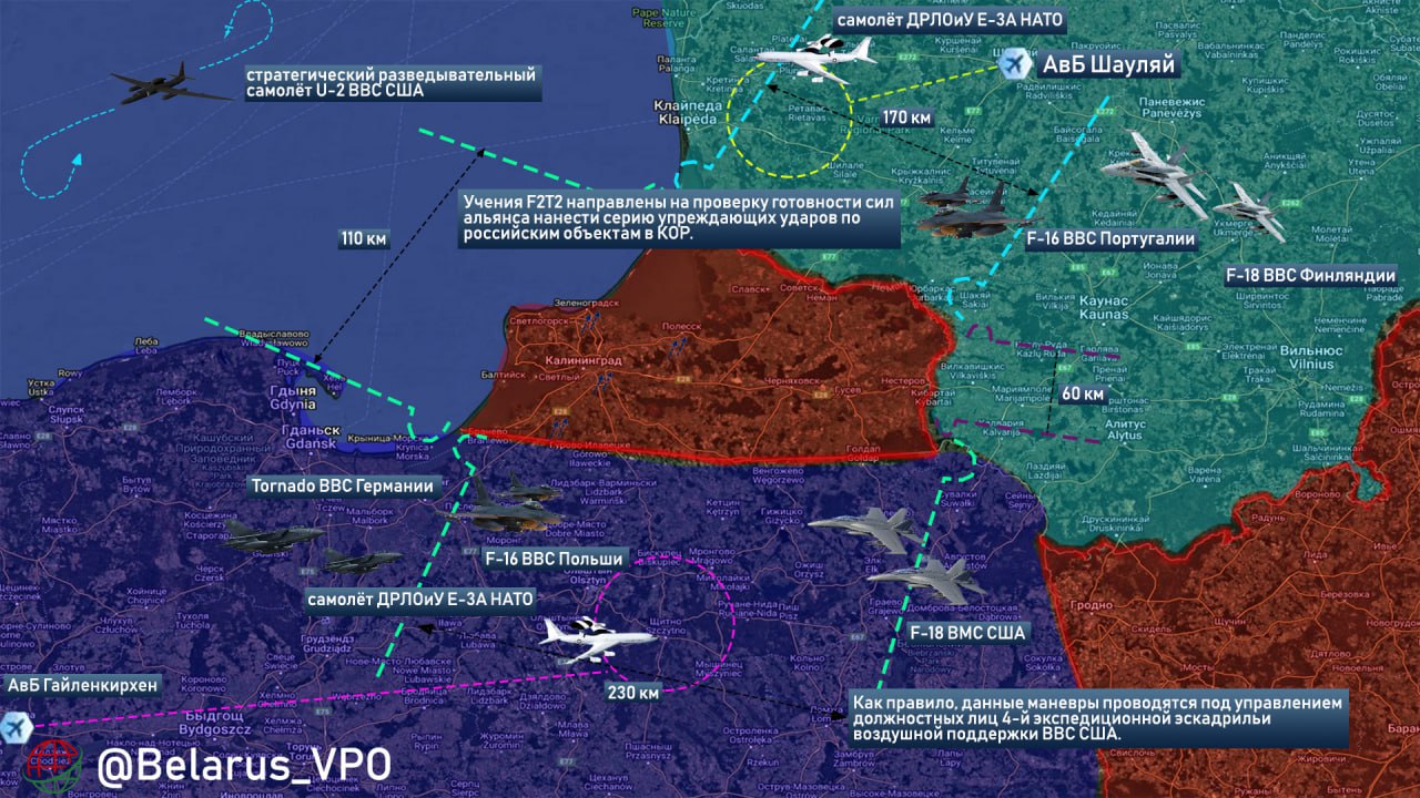 Как правило, в рамках F2T2 (найти, установить, отследить и поразить) отрабатывается разведка целей и нанесение ударов по целям на территории Калининградской области. Внимание альянса сосредоточено на военных объектах вблизи Янтарного и Мамонова, а также в фокусе «партнеров» силы и средства БФ в Калининградской обл.