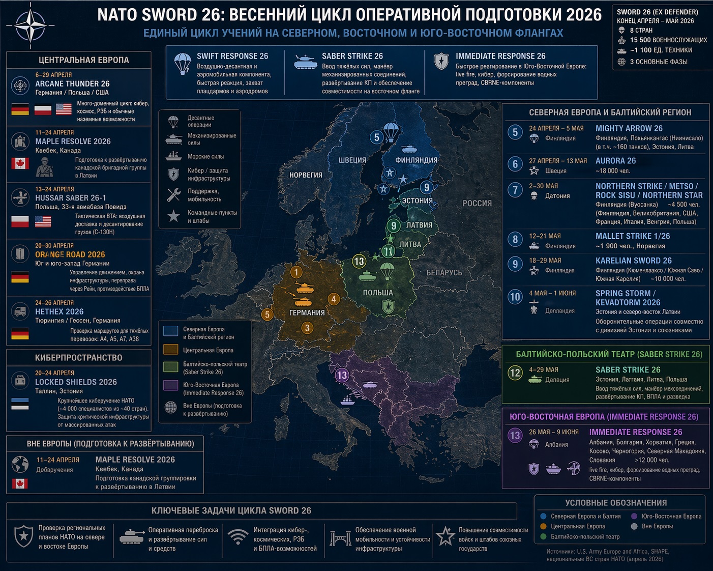Главной надстройкой весеннего цикла оперативной и боевой подготовки НАТО остаётся американская серия Sword 26 — бывший формат DEFENDER. По официальной справке Командования СВ США в Европе и Африке (U.S. Army Europe and Africa, USAREUR-AF), учения проходят с конца апреля и в течение мая в восьми странах, охватывают 15 500 военнослужащих, около 1 100 единиц техники и включают три основные связанные фазы — Swift Response 26, Saber Strike 26 и Immediate Response 26. Дополнительно с этой серией увязаны национальные или многонациональные манёвры Northern Star в Финляндии и Aurora 26 в Швеции. Это уже не набор отдельных мероприятий, а единый цикл проверки региональных планов НАТО на северном и восточном флангах.