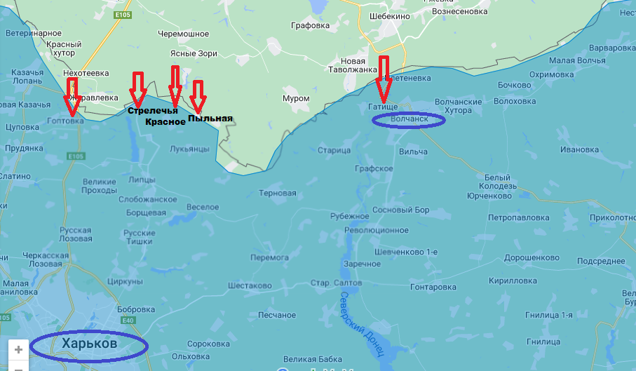 После мощной ночной авиационной и артподготовки, наши двинули сразу в нескольких направлениях. Звучат названия сел Гоптовка, Красное, Стрелечья, Пыльная… По сообщениям, последние два населенных пункта уже за нами. Восточнее наши взяли направление на село Гатище и далее на город Волчанск (7 км от границы).
