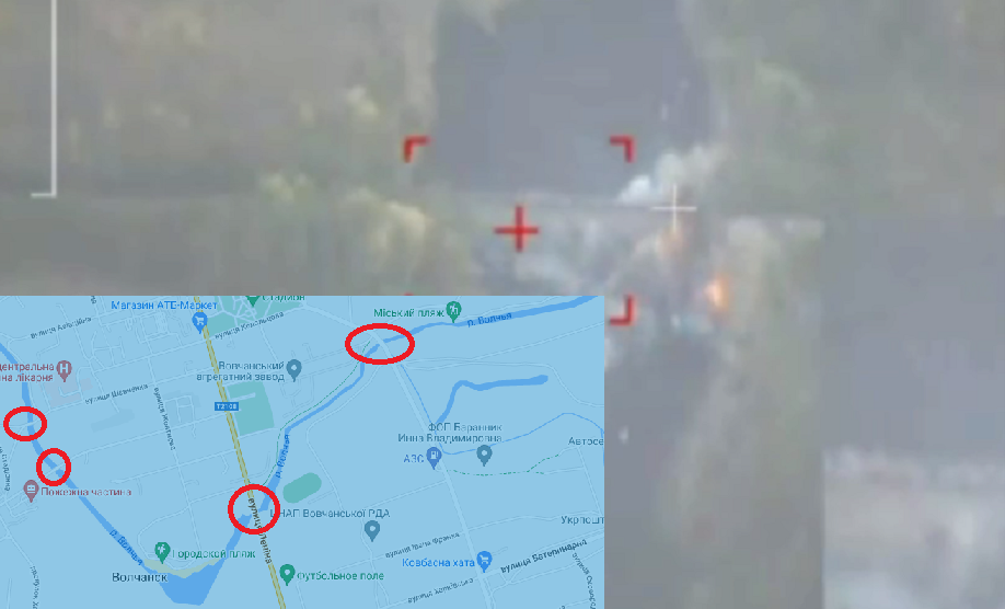 Попутно наши профессионалы отправили на вечный покой мост в Волчанске через реку Волчья. Мостов в городе несколько, но что-то мне подсказывает, что приказал долго жить главный из них. Вот фото и карта на которой обозначены переправы.