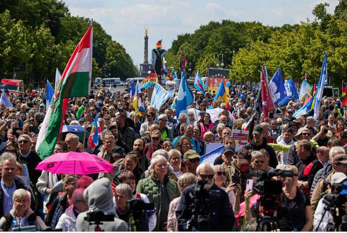 Манифестация под названием «Мир. Свобода. Всенародное голосование» началась около 13:00 (14:00 мск). В настоящее время люди продолжают заполнять улицу 17 Июня, ведущую от Колонны Победы до Бранденбургских ворот. По данным берлинской полиции, на демонстрацию зарегистрировались 10 тыс. участников. В руках манифестанты держат голубые флаги с голубем мира, флаги Германии и воздушные шарики.