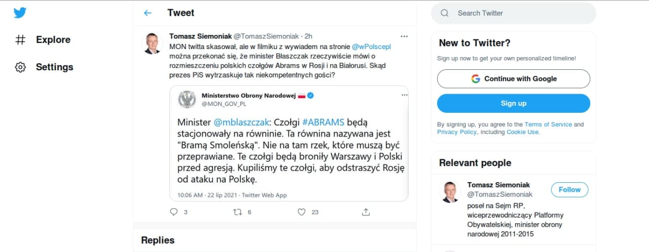 В свою очередь, Томаш Семоняк заявляет, что купленные Польшей у США танки М1″Абрамс» (250 ед) будут размещены у границ с Беларусью и Россией не для обороны, а для агрессии.