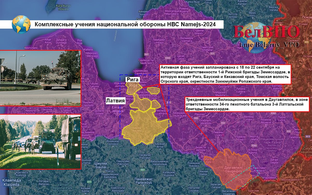 Особенностью Namejs-2024 в т.г. являются мобилизационные учения непосредственно у границы Беларуси – в Даугавпилсе, в зоне ответственности 34-го пехотного батальона 3-й Латгальской бригады Земессардзе. Как заявлено, запланирована проверка механизмов мобилизации для дальнейшего их совершенствования.