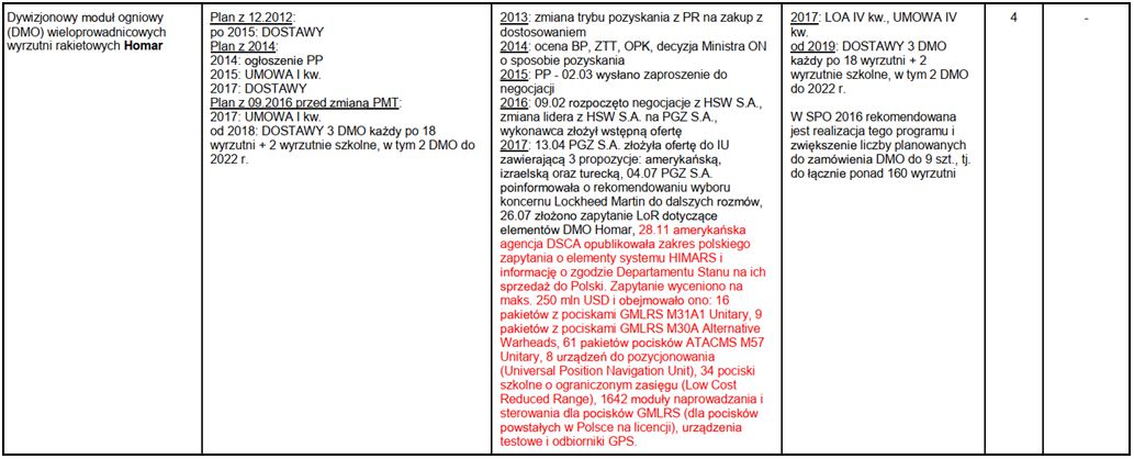 В частности, в рамках «программы технической модернизации» (ПТМ) Польши насчитывается не менее 100 различных программ закупки современного вооружения. Одной из них является программа 2012 года с названием «Лобстер» (на фото выдержка из ПТМ от 18.12.2017). В рамках нее планировалось закупить до 2022 года 18 дивизионов РСЗО. Кроме того, дополнительно предполагалось приобретение двух дивизионов для обучения.