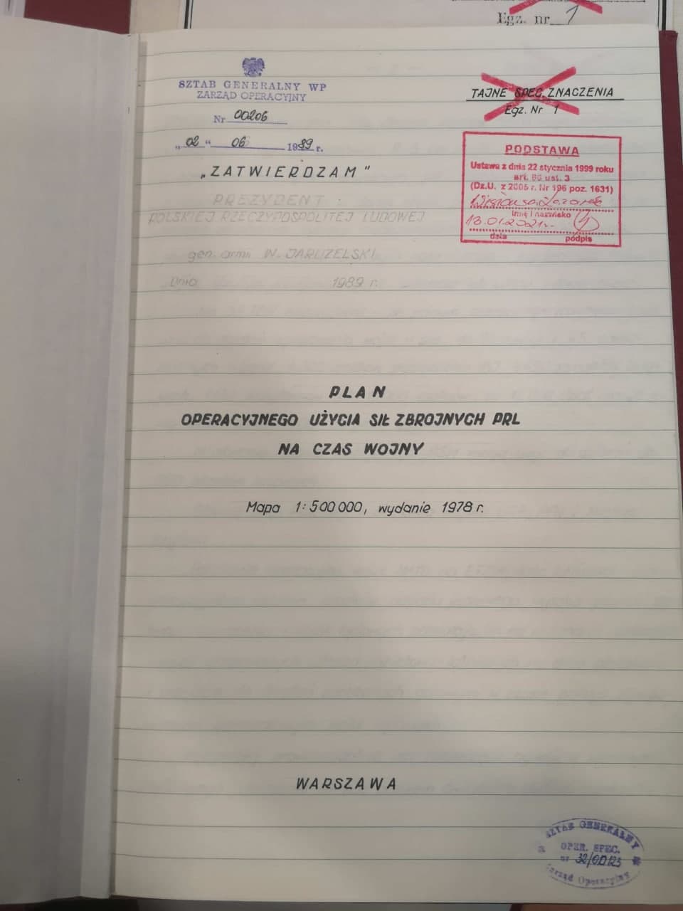 Документ был зарегистрирован в польском Генштабе 2 июня 1989 года, но так и не был подписан главой государства, хотя уже был к тому времени согласован с начальником Генштаба ВС СССР и командующим ОВС Варшавского договора.